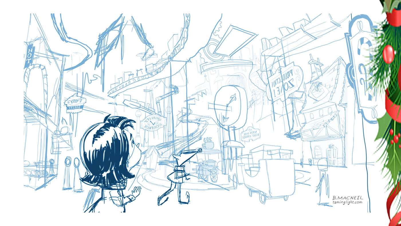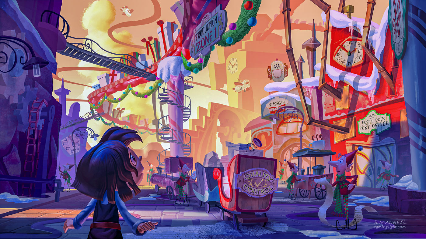 Auntie Claus is a stop motion film by Athena Studios, based on the original story by Elise Primavera. Included here is the early development art I created for various moments in the film.