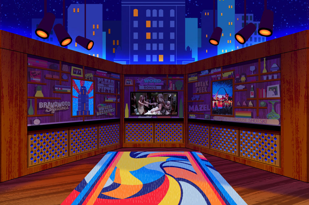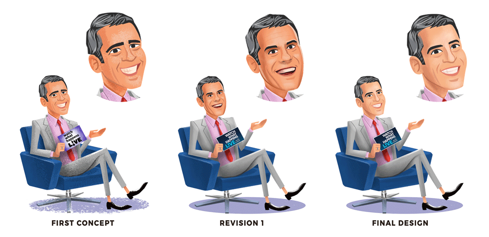 Final Version of the Watch What Happens Live Clubhouse with a cartoon Andy Cohen and his dog Wacha